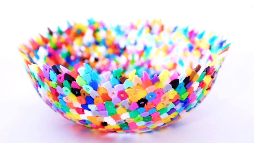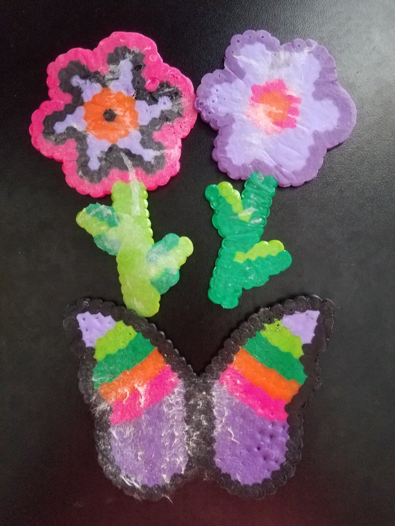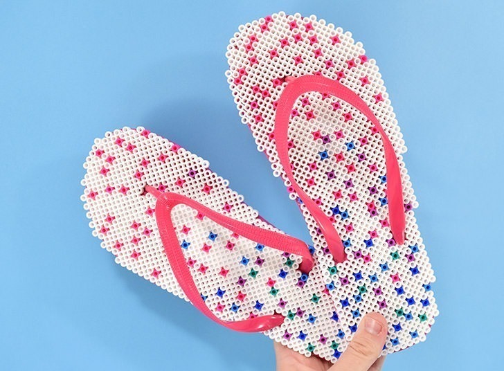 I love the drink coasters. There are so many possible designs you can do for them; just glue a thin sheet of cork under one and you’re good to go. The bowl is a little different in that you carefully arrange beads into a heat-safe bowl, place it in the oven, and it’ll come out like that. Pretty cool! The rainbow wind-spinner is perfect for a breezy day, and the flip flops look cute but I’ll admit I’m not too sure how comfortable they’d be, haha!