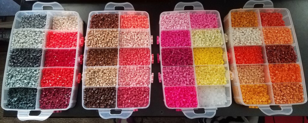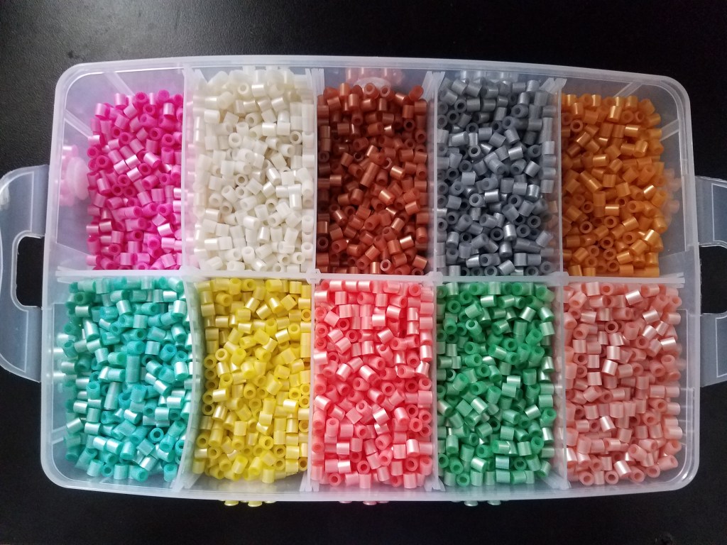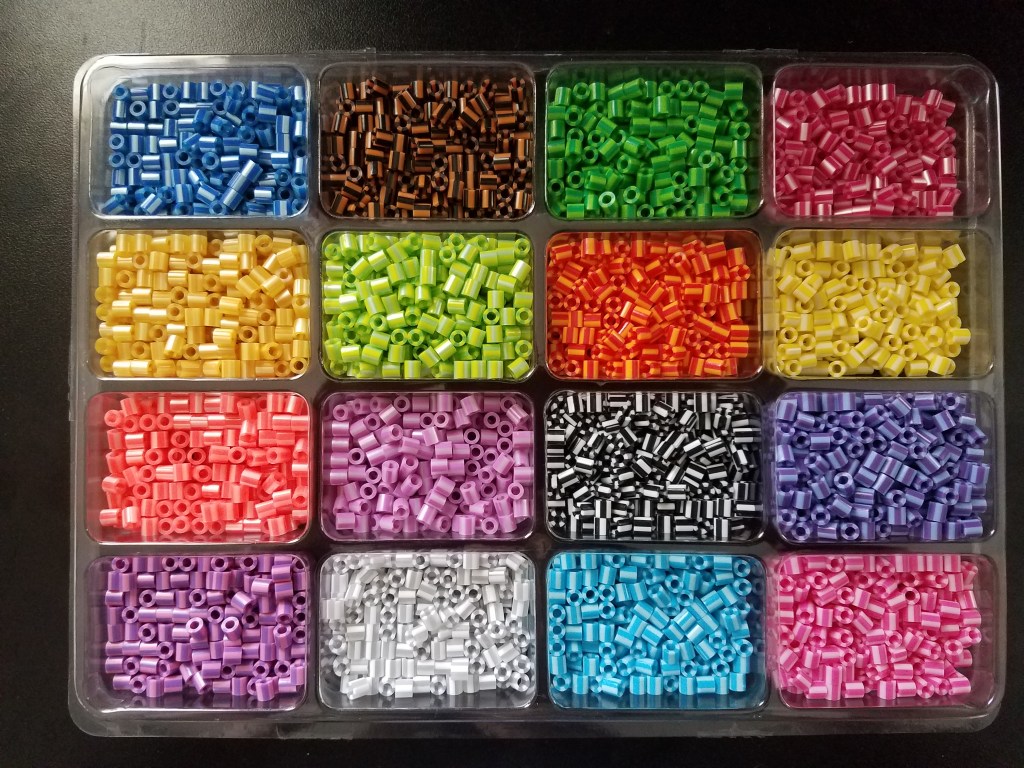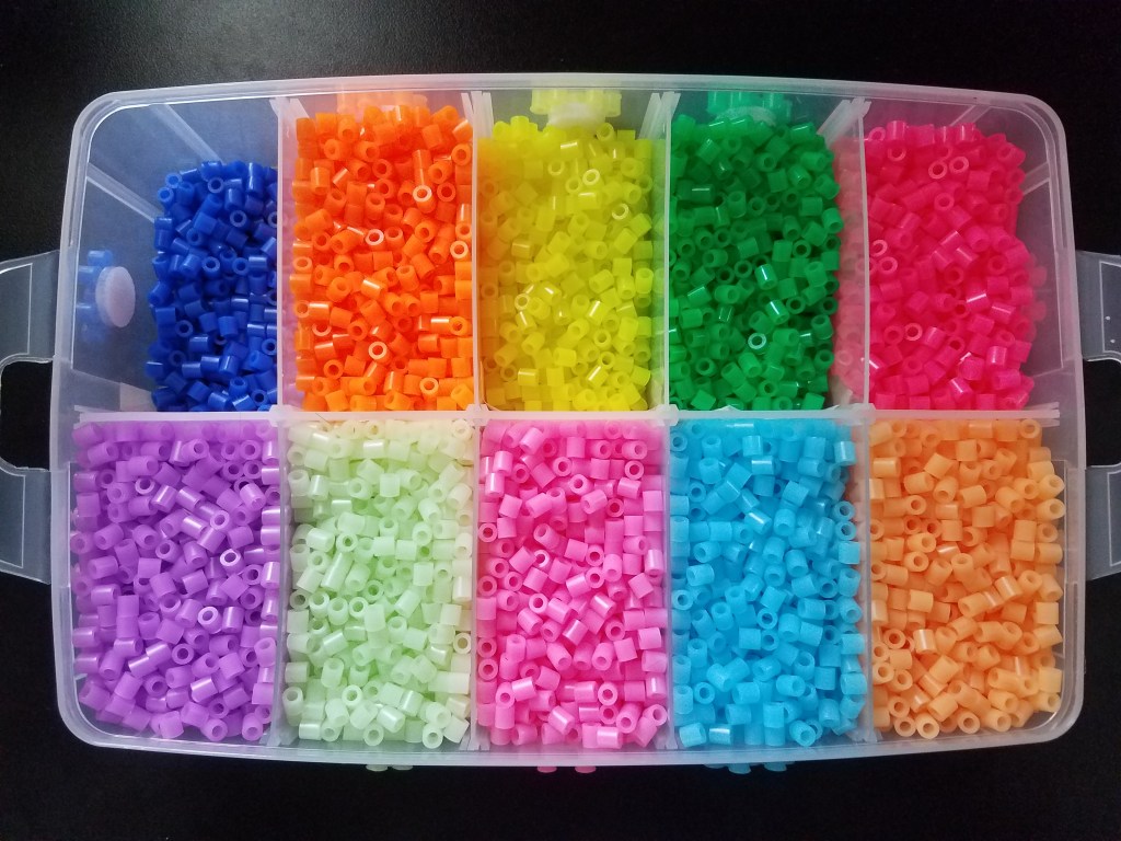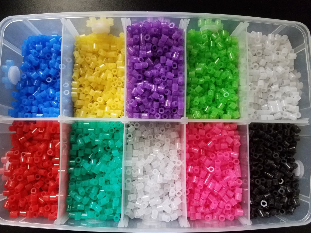 Finally, storage containers are perhaps the MOST IMPORTANT accessory for your perler beads. After all, you have to have somewhere or something to put them in, right? Which kind you use is completely up to you. I personally keep all my beads in the stack-able storage trays. I find there is just enough space in the compartments for full 1000 bead bags and I can differentiate the colors much easier. Depending on how big of a storage container you choose, prices may range from $5-$20.
