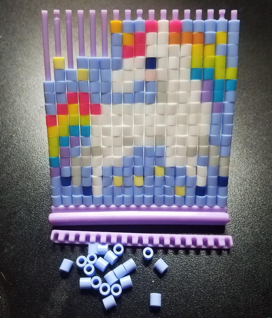 Contrary to their name, Sliders do not refer to delicious tiny sandwiches. I found Sliders to be a somewhat different experience from typical perler beading. Rather than spreading beads across a board, you’re instead stacking them across multiple rods. It’s almost akin to weaving a tapestry. This activity is easily more delicate than the Stixels because it doesn’t take much to snap the rods out of place from the top holding them together. Definitely more of a show-off piece, and the kits even give you a stand to place it on.